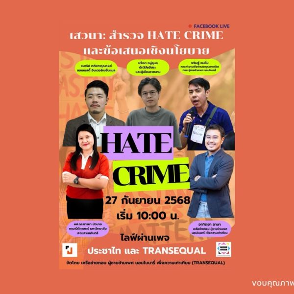 News การเสวนาโดยเครือข่าย TransEqual ชี้ Hate Crime รุนแรงกว่าอาชญากรรมทั่วไป เสนอรัฐแก้กฎหมายและเก็บข้อมูลอย่างจริงจัง เขียน: ภัชราพรรณ ภูเงิน ข้อมูลจากการเสวนาโดยเครือข่ายทอม ผู้ชายข้ามเพศ นอนไบนารี่ เพื่อความเท่าเทียม ระบุว่าอาชญากรรมจากความเกลียดชังรุนแรงกว่าอาชญากรรมทั่วไป เพราะมีแรงขับจากความเกลียดชัง พร้อมเสนอให้ทุกภาคส่วนร่วมกันแก้ปัญหา ผลักดันกฎหมายการลงโทษผู้กระทำผิดแบบขั้นบันไดและเสนอให้มีการเก็บข้อมูลอย่างจริงจัง เมื่อวันที่ 27 กันยายน ในงานเสวนาออนไลน์ ‘สำรวจ ... Login to bookmark this article Login to bookmark this article