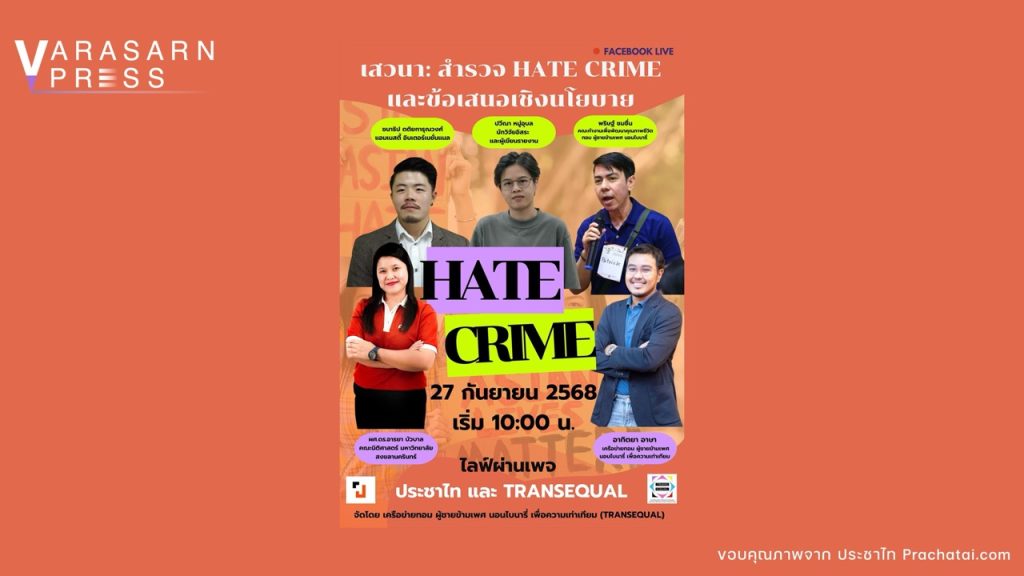 เมื่อวันที่ 27 กันยายน ในงานเสวนาออนไลน์ ‘สำรวจ HATE CRIME และข้อเสนอเชิงนโยบาย’ ที่จัดขึ้นโดยเครือข่ายทอม ผู้ชายข้ามเพศ นอนไบนารี่ เพื่อความเท่าเทียม (TransEqual) นักวิชาการและนักกิจกรรมนำเสนอข้อมูลที่สนใจว่า Hate Crime หรืออาชญากรรมจากความเกลียดชัง มีความรุนแรงกว่าอาชญากรรมทั่วไป เพราะมี Hate Speech หรือคำพูดที่แสดงความเกลียดชังเข้ามาเกี่ยวข้อง อีกทั้งข้อมูลยังระบุว่า สื่อมีส่วนในการผลิตซ้ำอคติทางเพศต่อกลุ่มผู้มีความหลากหลายทางเพศหรือ LGBTQ+ ทำให้ปัญหานี้ยิ่งรุนแรงขึ้น ทางออกของปัญหาจึงต้องอาศัยความร่วมมือจากสังคมและภาครัฐ และการปรับปรุงกฎหมายที่เกี่ยวข้องกับอาชญากรรมจากความเกลียดชังในอนาคต